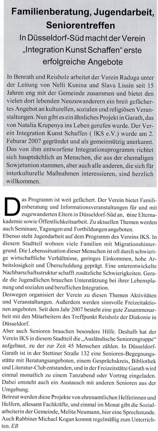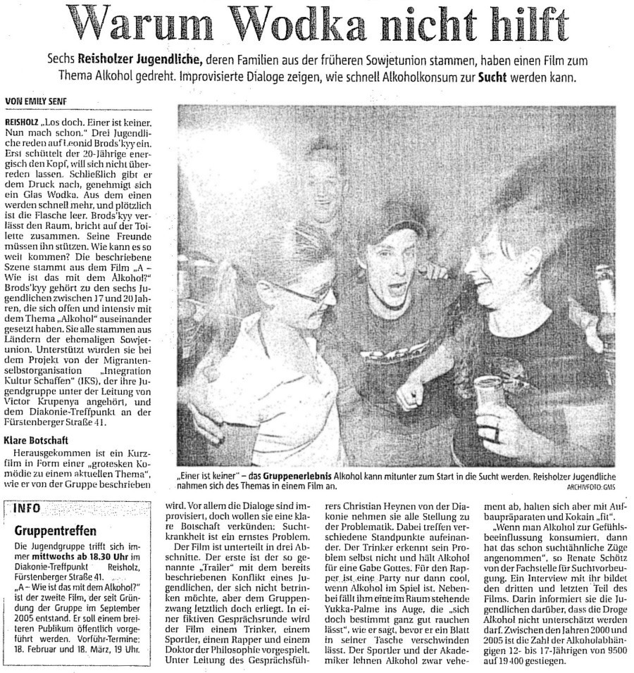 "Warum Wodka nicht hilft" Rheinische Post, Benrather Tageblatt, 16. Februar 2009 |